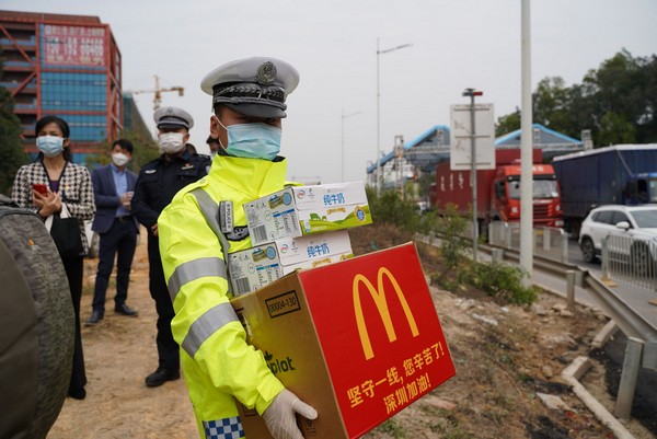 你們在一線戰(zhàn)疫,我們來為你補給!隨后,市關(guān)愛辦攜手伊利集團、麥當勞先后前往光明羌下公安檢查站、寶安區(qū)松安防疫檢查點,為正在一線忙碌的工作人員,送上愛心牛奶與熱乎乎的愛心午餐?!澳銈冃量嗔恕?、“繼續(xù)加油”……每發(fā)放一次牛奶與午餐,工作人員都不忘了戰(zhàn)疫者們致敬致謝。