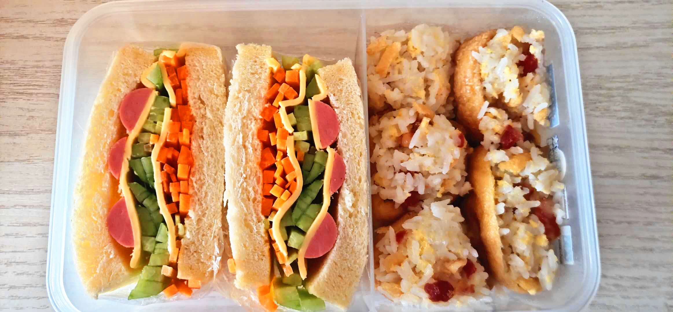 胡蘿卜和青瓜切絲,臘腸切成?;鹜饶c對(duì)半切,準(zhǔn)備面包四片,芝士片四片。拿一張保鮮膜,將一片面包片放在上面,然后依次擺上胡蘿卜、芝士片、青瓜片和火腿腸片,再放上一片面包片,用保鮮膜包起來(lái)。包緊,然后從中間切成兩半,裝在飯盒里即可。將臘腸粒放在剩飯里,加鹽和醬油一起拌均后,再放進(jìn)掏空的豆腐泡里。整個(gè)豆腐泡隔水蒸大約十分鐘左右,再裝在飯盒就可以了。
