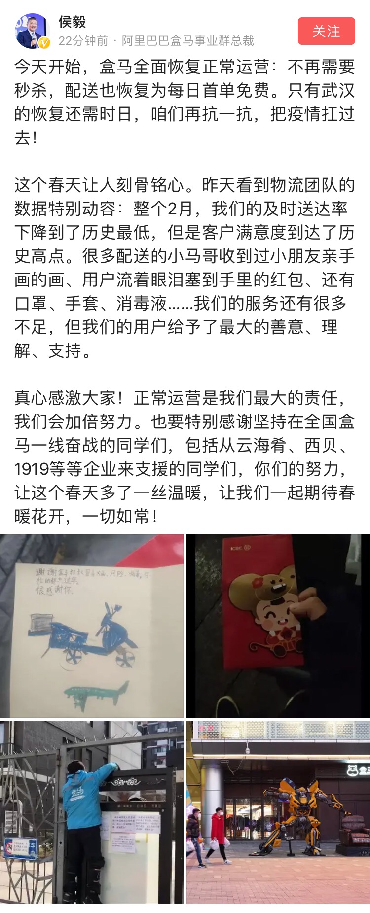 盒馬總裁侯毅在其社交平臺賬號上表示,盒馬全面恢復(fù)正常運營了,用戶也可以告別秒殺了,“疫情期間,正常運營是我們最大的責(zé)任,我們會加倍努力。武漢的恢復(fù)還需要一些時間,大家一起再抗一抗,把疫情扛過去。”