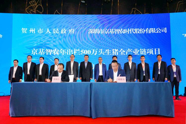見圳客戶端·深圳新聞網(wǎng)2020年5月25日訊 2020年5月22日,廣西東融先行示范區(qū)(賀州)建設(shè)發(fā)展若干政策新聞發(fā)布會暨“灣企入桂”賀州項(xiàng)目推介會在深圳舉行。推介會上,深圳市京基智農(nóng)時(shí)代股份有限公司 (以下簡稱“京基智農(nóng)”)與廣西賀州市人民政府簽署《京基智農(nóng)賀州市年出欄500萬頭生豬全產(chǎn)業(yè)鏈項(xiàng)目合作框架協(xié)議》,這意味著京基智農(nóng)生豬產(chǎn)業(yè)布局劍指千萬頭規(guī)模,現(xiàn)代農(nóng)業(yè)板塊駛?cè)氚l(fā)展的快車道。