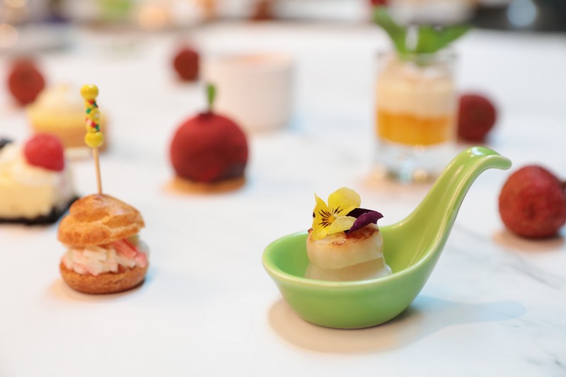 酒店餅房廚師長趙偉匠心獨(dú)運(yùn),使荔枝和傳統(tǒng)下午茶碰撞出別樣風(fēng)情:芒果恰到好處的酸甜邂逅荔枝的宜人甘美,香芒荔枝慕斯杯里滿載的不就是夏天的專屬甜蜜;芝士蛋糕的醇厚滋味被荔枝的清爽巧妙平衡,多層次的口感讓人無限回味;當(dāng)俏皮可人的荔枝被加入傳統(tǒng)甜品楊枝甘露,搭配冰涼爽口的荔枝雪芭,是妙趣橫生的獨(dú)特味覺體驗(yàn);法式焦糖燉蛋和荔枝的融合,恍若天成,是中西合璧的典范;日本帶子和荔枝的組合聽來不可思議,只有親試方能體會海陸鮮甜交匯的真意。