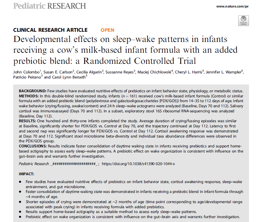 近日,一篇臨床研究揭示了寶寶腸道營養(yǎng)與睡眠間的關(guān)聯(lián)。據(jù)悉,這項研究于2014年啟動,是全球首個探究 PDX+GOS益生元組合配方奶粉與寶寶睡眠模式養(yǎng)成關(guān)系的雙盲隨機對照試驗。研究由美國堪薩斯大學(xué)壽命研究所John Colombo教授牽頭,美國堪薩斯大學(xué)醫(yī)學(xué)中心營養(yǎng)學(xué)系、智利大學(xué)營養(yǎng)與食品技術(shù)研究所睡眠與功能性神經(jīng)生物學(xué)實驗室等多個國際知名研究機構(gòu)共同參與。這項研究在經(jīng)研究同行的層層學(xué)術(shù)審評后,近日于《兒科研究》上正式發(fā)表,成果獲得科學(xué)界認可。