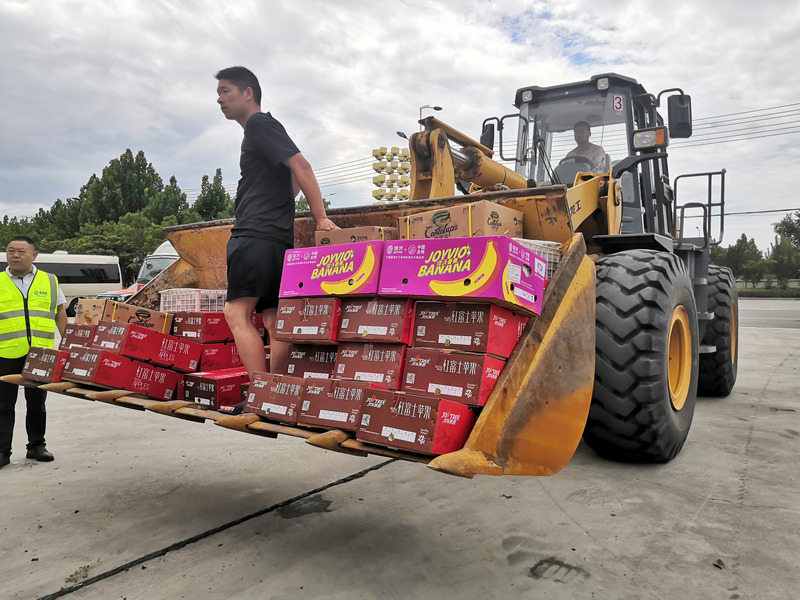 鏟車接力運(yùn)送賑災(zāi)愛心水果。