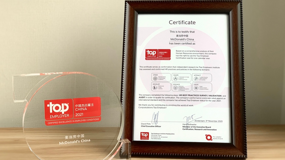 近日,麥當勞中國榮獲杰出雇主調研機構(Top Employers Institute)的“中國杰出雇主2021”認證。