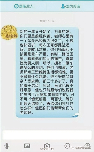 爆料帖中同時(shí)上傳了多張聊天記錄,其中一張顯示:“新的一年又開始了,萬事待發(fā),你們更是前程似錦。老師心里有個(gè)念頭已經(jīng)很久了,小孩也快四歲了,每次回家都路途遙遠(yuǎn),要轉(zhuǎn)幾次車,你們師母和小孩更是暈車嚴(yán)重,有時(shí)一路吐回家,看看他們?nèi)绱送纯啵媸抢槟腥税?!所以,擁有一輛車是多么的迫切。你們也知道老師那些工資維持生活都很艱難,更不敢有什么想法,也不好向父母親人求助,都三十多歲了,真的羞于啟齒!所以,雖然也很不好意思,但是也只能跟你們說說我的想法了:大家如果有能力的,可不可以慷慨解囊一兩百塊,等你們哪天結(jié)婚了,再給你們打紅包怎么樣?但愿你們能幫幫你們的老師吧?!?/p>