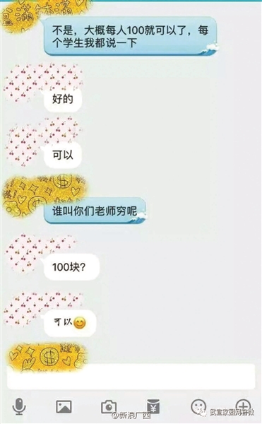 在被曝光的聊天記錄中,該老師曾表示,“大概每人100就可以了,每個(gè)學(xué)生我都說一下?!辈⒔忉屨f,“誰叫你們老師窮呢?”聊天記錄顯示,群內(nèi)多名學(xué)生回復(fù)稱,“可以?!?/p>
