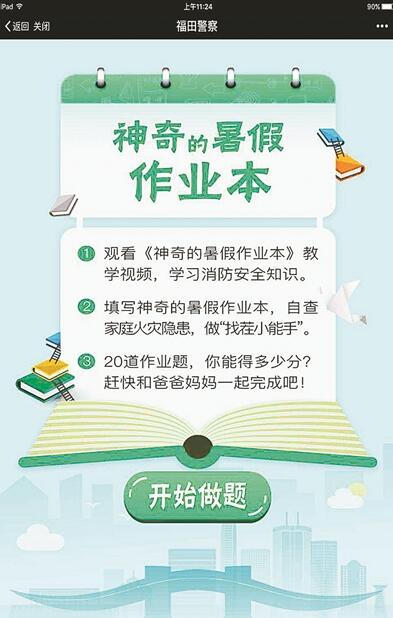 據(jù)介紹,完成這個(gè)作業(yè)并不難,只需分三步,第一步是關(guān)注微信公眾號“福田警察”觀看視頻,第二步是掃描二維碼直達(dá)《神奇的暑假作業(yè)本》,第三步是在家長陪同下認(rèn)真完成家庭火災(zāi)隱患排查。當(dāng)然,最重要的是填寫信息欄,將火災(zāi)隱患反饋到后臺?!白鳂I(yè)本”打開后,各種常見的消防隱患會一一展現(xiàn)在眼前。說是作業(yè),它其實(shí)更像一個(gè)假期實(shí)踐,通過生動(dòng)的視頻和有針對性的問答,取代過去紙質(zhì)版消防安全宣傳冊的作用。