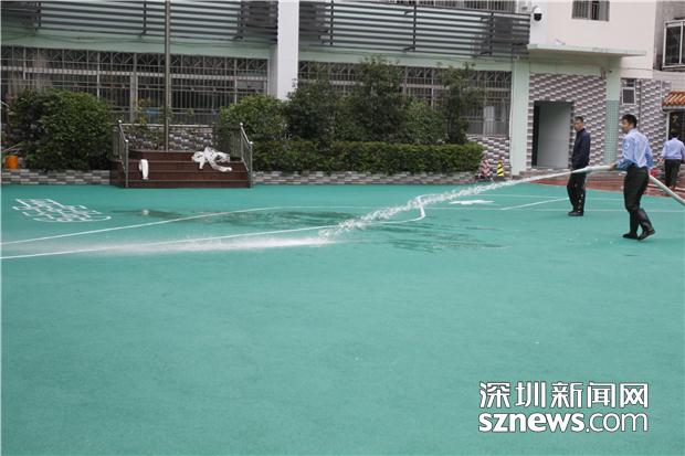 羅湖螺嶺外國語實驗學(xué)校二部通過沖水的方式,清除跑道的異味