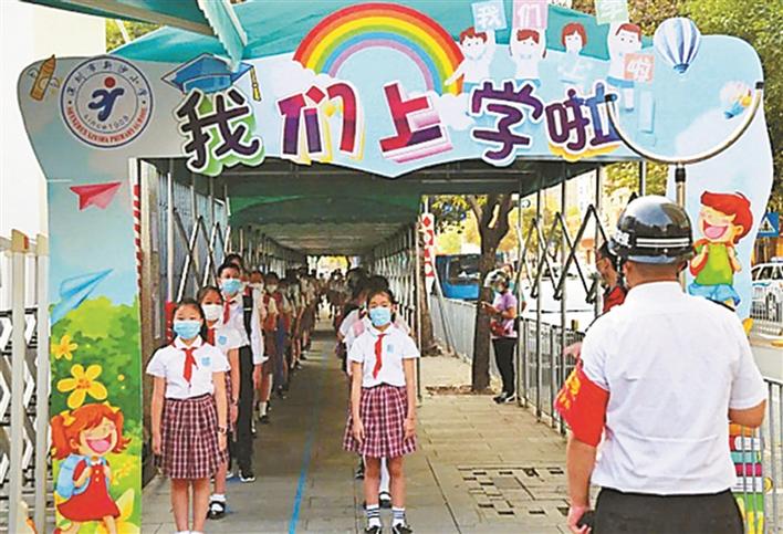 健康副校長和指導員在新沙小學指導防疫工作,引導學生有序入校。