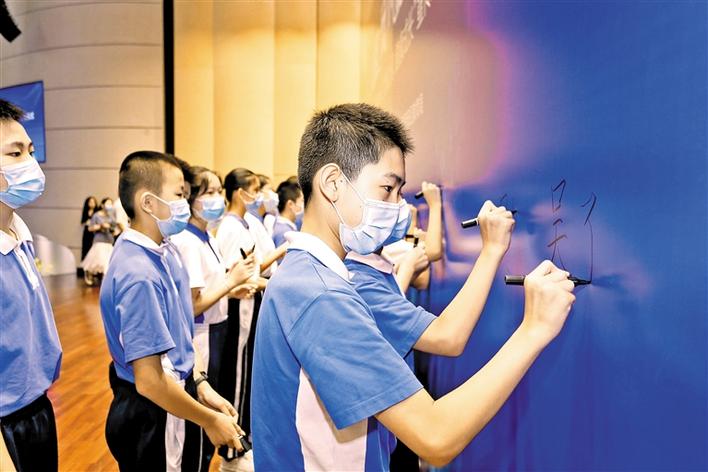 “自覺遵守互聯(lián)網(wǎng)相關(guān)政策和法律法規(guī),積極培育和踐行社會主義核心價(jià)值觀……”海韻學(xué)校的學(xué)生們現(xiàn)場朗讀《寶安青少年“文明上網(wǎng)·健康成長”倡議書》,并在承諾墻上莊嚴(yán)地簽下自己的名字。