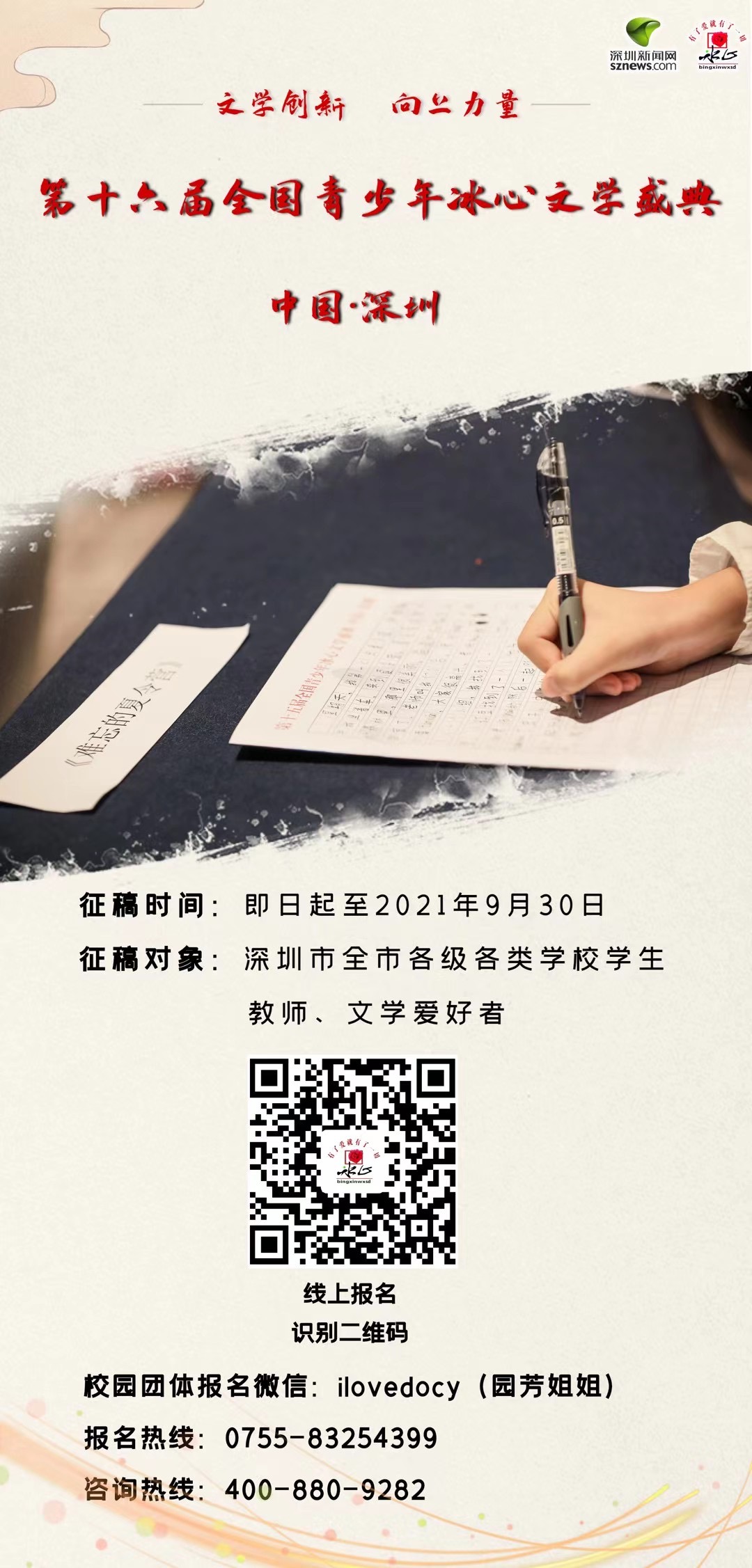 見圳客戶端·深圳新聞網(wǎng)2021年3月2日訊 為繼承和發(fā)揚(yáng)中華文化及冰心文學(xué)精神,促進(jìn)中華文化、中國現(xiàn)代化文學(xué)史更深入地植入深圳下一代青少年心中,奠定堅實(shí)的中國社會主義現(xiàn)代化建設(shè)根基,2021年“第十六屆全國青少年冰心文學(xué)盛典中國·深圳”正在愛好文學(xué)的師生學(xué)友們之間熱烈展開。