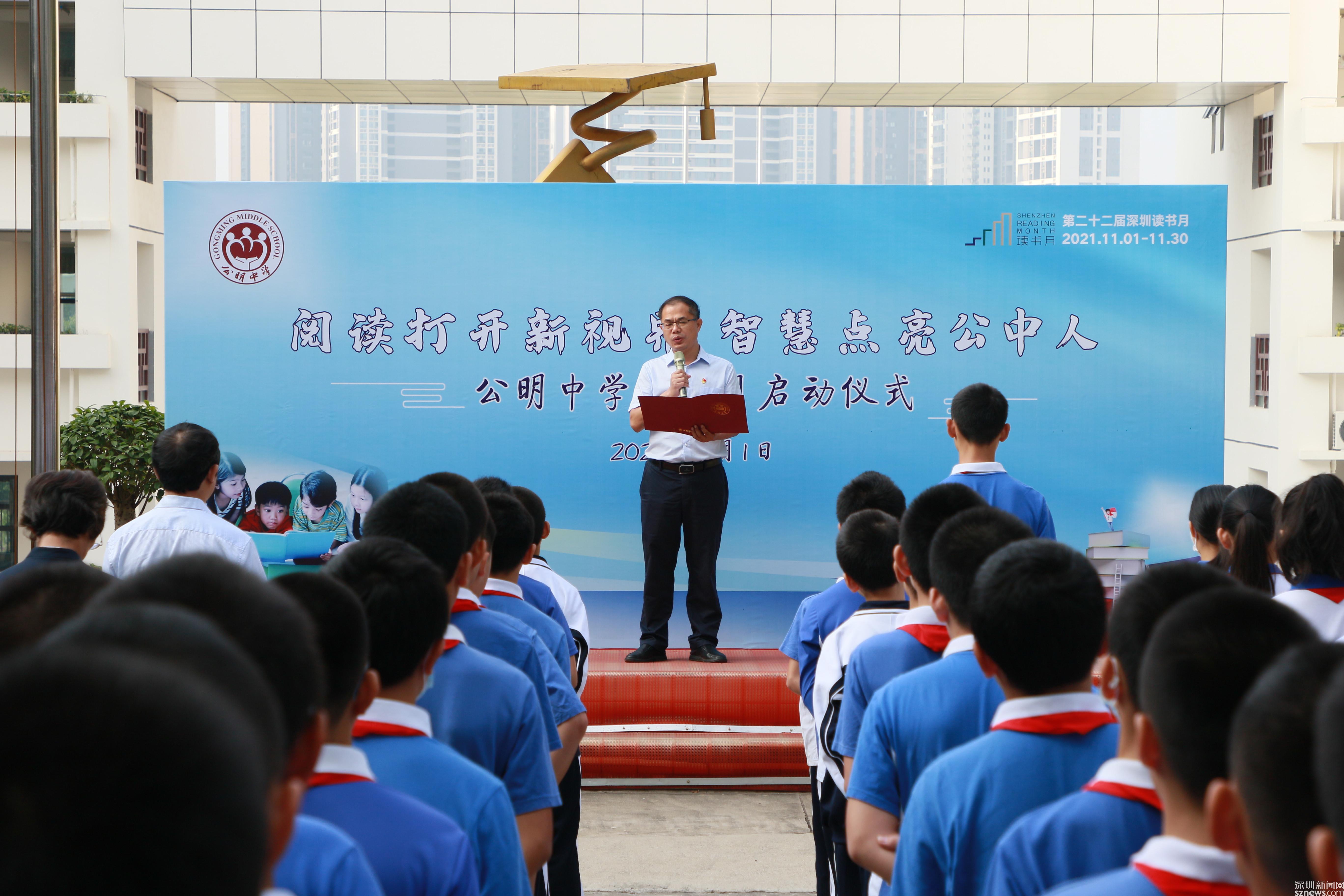 “公明中學(xué)將用閱讀賦予校園知書(shū)達(dá)理的文化氣息,用知識(shí)開(kāi)闊眼界,用經(jīng)典浸潤(rùn)心靈,用書(shū)為伴博覽同行。”華建明校長(zhǎng)指出,深圳正傾力打造具有世界影響力的閱讀文化品牌,公明中學(xué)將以深圳讀書(shū)月為依托,由黨員、行政帶頭學(xué)習(xí),做讀書(shū)活動(dòng)的組織者、參與者和引導(dǎo)者,做師生學(xué)習(xí)的表率,鼓勵(lì)師生愛(ài)讀書(shū),讀好書(shū),學(xué)會(huì)讀書(shū),在閱讀中發(fā)揮“恒、勤、思、用”的精神,引導(dǎo)閱讀文化向縱深發(fā)展,在全校形成“專(zhuān)家指導(dǎo)、陣地支持、全員參與”的讀書(shū)格局,增厚公中文化底蘊(yùn)。