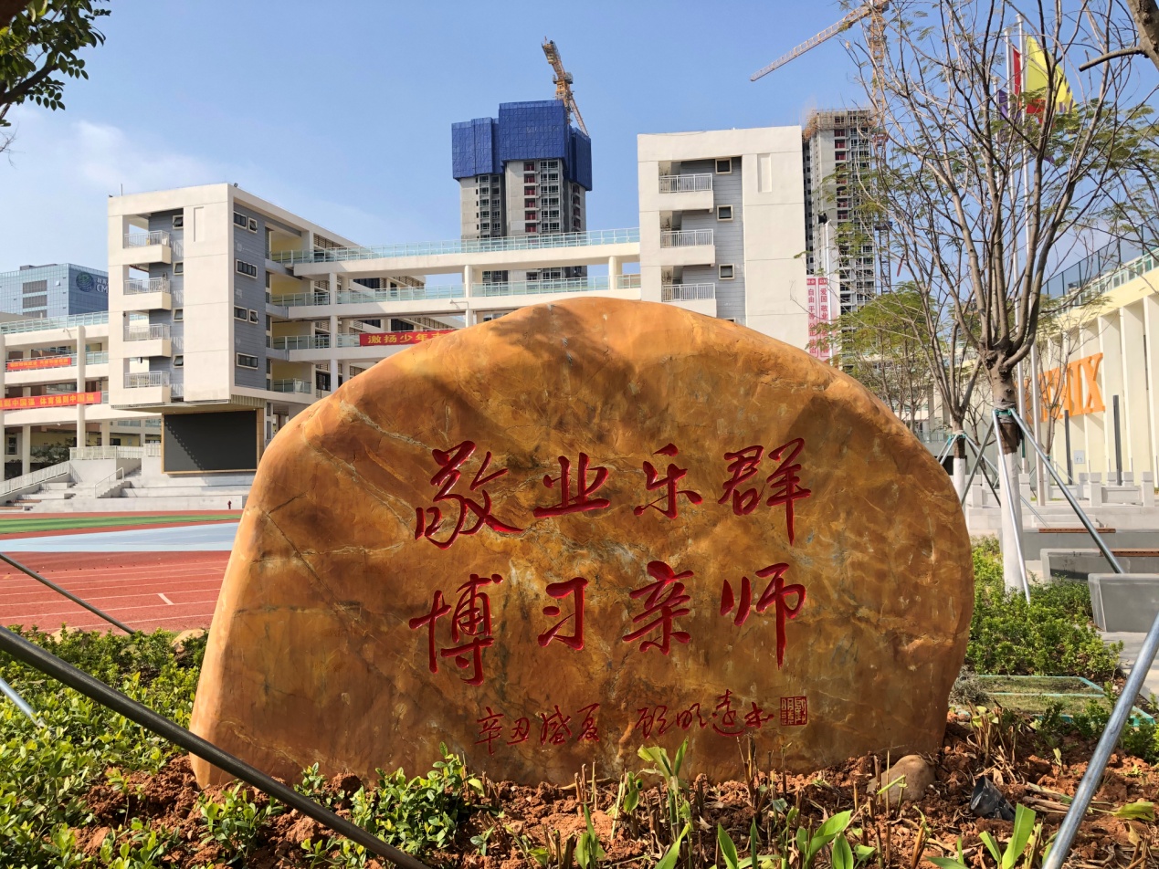 2021年底,學(xué)校啟用新東門,門右側(cè)墻壁上則是神采奕奕的校名:深圳市光明區(qū)鳳凰學(xué)校。經(jīng)東門而入校園,呈現(xiàn)在眼前的是一塊碩大刻石,其辭曰:敬業(yè)樂(lè)群,博習(xí)親師。