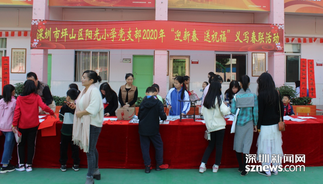 近日,深圳市坪山區(qū)陽(yáng)光小學(xué)開(kāi)展“迎新春 送祝?!绷x寫春聯(lián)活動(dòng),老師們現(xiàn)場(chǎng)揮毫?xí)鴮懸桓备痹⒁庑麓鹤85拇郝?lián),為社區(qū)居民、家長(zhǎng)奉上美好祝愿。