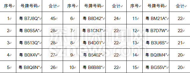 交通違法記錄大于20次的15輛車如下: