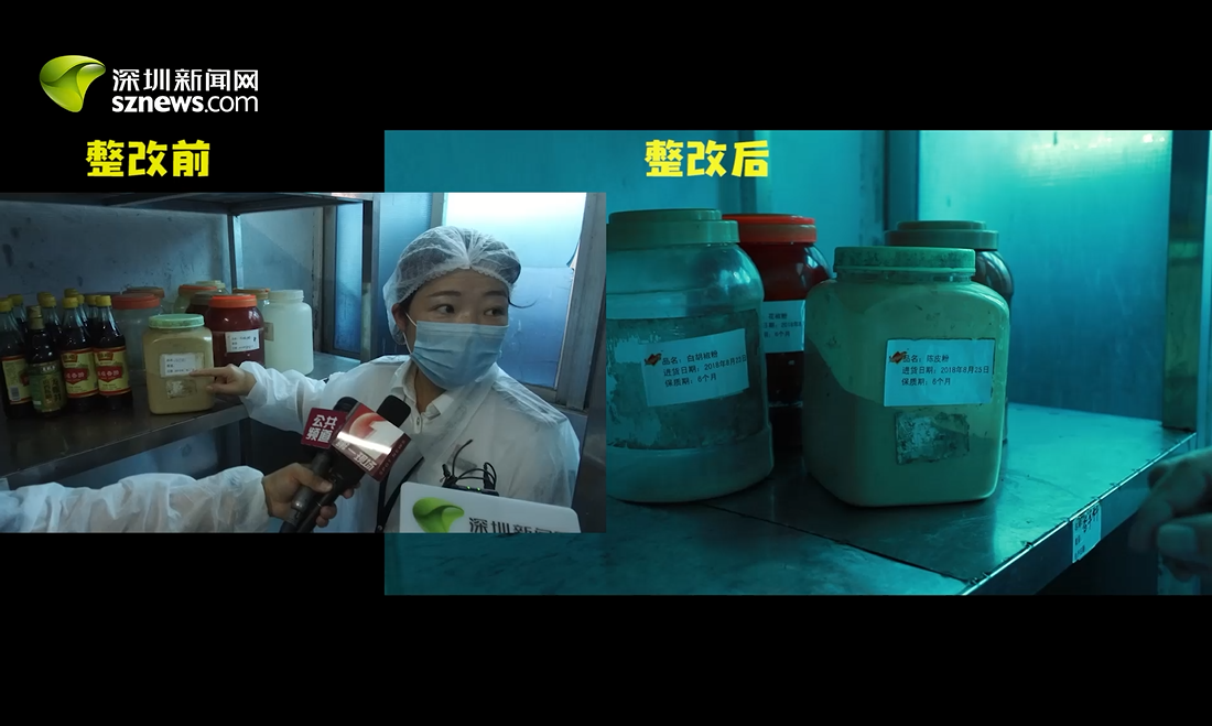 29日突查發(fā)現(xiàn),調(diào)配間調(diào)料打開后未貼標(biāo)簽。今日深圳新聞網(wǎng)回訪發(fā)現(xiàn),現(xiàn)已加貼完整標(biāo)簽,包括品名、進(jìn)貨日期和有效期等信息。