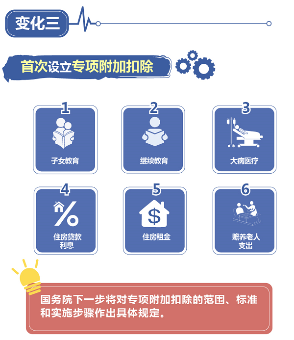 此次個稅改革再次提高基本減除費用標(biāo)準(zhǔn)和優(yōu)化稅率結(jié)構(gòu)。從今年10月1日起,基本減除費用標(biāo)準(zhǔn),也就是俗稱的起征點,將從原來每人每月3500元提高至5000元(每人每年6萬元)。