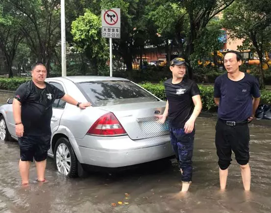 ▲ 16日,深圳市內(nèi)出現(xiàn)了大量積水,馬友們幫助涉水車(chē)主拖車(chē) / 受訪者供圖