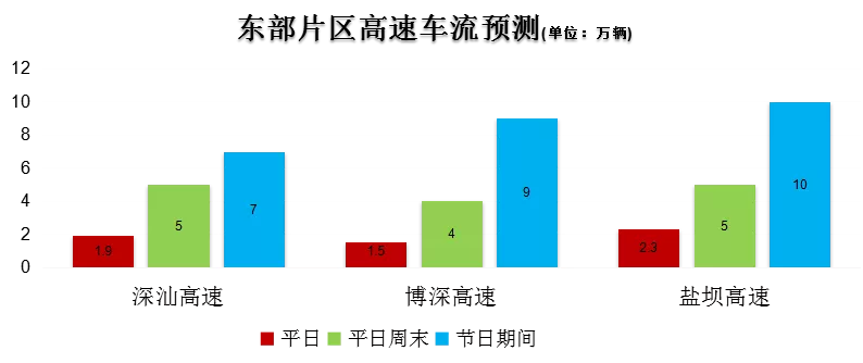 預(yù)計東部片區(qū)高速在假期后兩天車流增加,從下午至晚上21時許恢復(fù)正常,尤其是深汕高速和鹽壩高速從每天10時開始車流增大,并于19時左右達(dá)到峰值,車流緩行情況將一直持續(xù)到晚上23時。