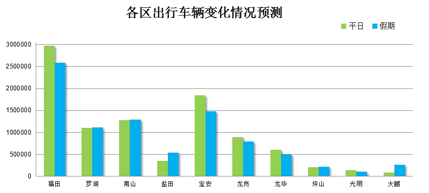 除以上兩個區(qū)域外,我市其余各區(qū)車輛會較平日有所下降,而原關(guān)外的福田、寶安、龍崗,出行車輛數(shù)下降較為明顯,整體來看,全市出行車輛數(shù)將減少6%。