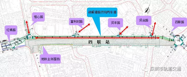 四聯(lián)站位于紅棉路與橫崗一號路、恒心路交叉口,沿紅棉路東西方向布置,為地下雙層島式車站(局部三層)。紅棉路為東西向主干道,規(guī)劃路寬50m,現(xiàn)狀路寬35m,雙向6車道,車流量較大。車站北側為新城匯商場,西北側為康樂幼兒園,西南側為信義錦繡花園,南側為康樂五區(qū)住宅小區(qū),人員相對密集。