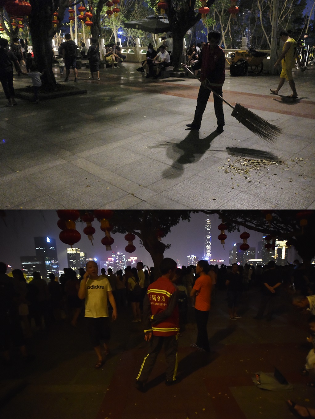 10月8日晚,蓮花山觀景臺(tái)的看燈人潮并沒(méi)有燈光秀首秀那一天洶涌,燈光表演過(guò)后,只有兩名清潔工人留下來(lái)進(jìn)行垃圾清掃?!敖裢砝??!必?fù)責(zé)蓮花山觀景臺(tái)區(qū)域的環(huán)衛(wèi)工人告訴記者,“我們?cè)跓艄庑闫陂g看到垃圾就會(huì)及時(shí)清理,一般散場(chǎng)之后一個(gè)小時(shí)是清掃時(shí)間,但今天這個(gè)工作很快就完成了,深圳人素質(zhì)還是很高的,基本很少有人會(huì)亂丟垃圾?!?/p>