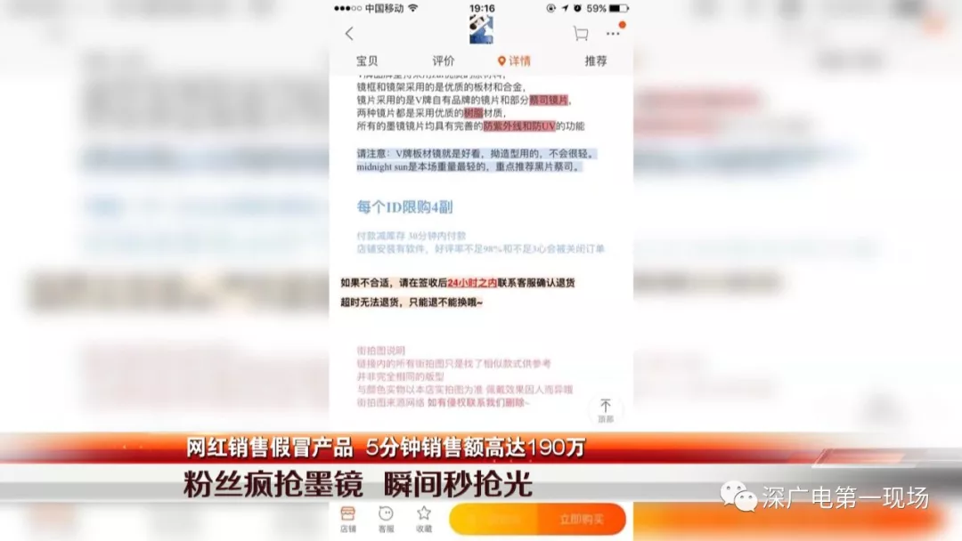 2018年年初,網(wǎng)紅“貓娘”開始在網(wǎng)上做秒搶某知名品牌的墨鏡的預(yù)熱廣告,聲稱原價(jià)1千多的正品只需要三分之一的價(jià)格就可以秒搶,吸引了大量粉絲關(guān)注。正式銷售當(dāng)天,短短5分鐘的時(shí)間,粉絲就瘋狂搶購了三千多付墨鏡,銷售額達(dá)到190萬元。