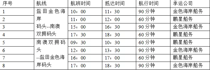 鹽田金色海岸碼頭至南澳雙擁碼頭公共交通航班時(shí)間及價(jià)目表