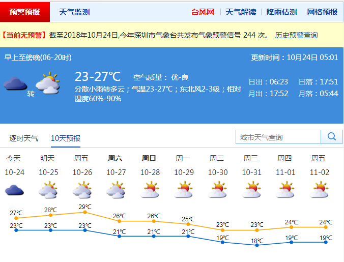 本周中后期,深圳早晚清涼,中午炎熱,最高氣溫維持在28℃-29℃,最低氣溫22℃-23℃,溫差增大,市民應注意預防感冒。本周末,受南下冷空氣影響,深圳最高氣溫回落至26℃左右,天氣較為舒適。