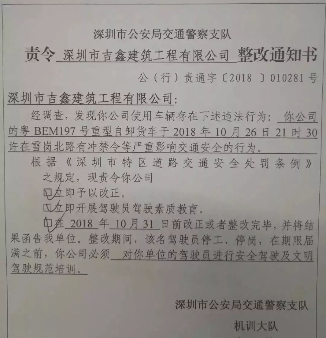 深圳交警依法對深圳市吉鑫建筑工程有限公司下達整改通知書,責令公司進行整改: