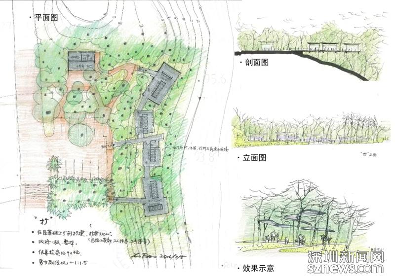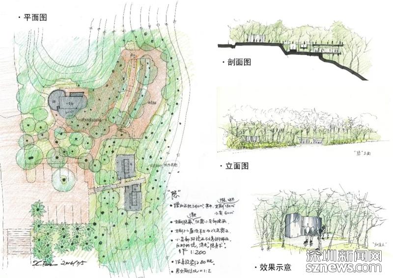 費曉華在文中提到,“隨著深圳人口和游客的劇增,蓮花山頂公共廁所已不堪負(fù)重,急需擴(kuò)大規(guī)模。2016年,本人受蓮花山公園管理處的邀請,免費為他們提供了改擴(kuò)建方案。方案共有兩種思路:‘隱擴(kuò)’和‘顯擴(kuò)’,均是在保留原建筑的基礎(chǔ)上,擴(kuò)大使用面積以滿足更多人的需求。從更好地保護(hù)自然環(huán)境的角度出發(fā),本人推薦‘隱擴(kuò)’方案。” (附設(shè)計圖)