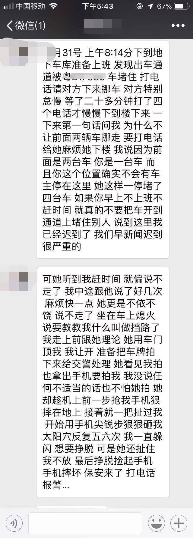 李小姐說(shuō),當(dāng)天早上8點(diǎn)14分,她下到車庫(kù)準(zhǔn)備開(kāi)車上班,發(fā)現(xiàn)出車通道被一輛黑色小車阻擋。她便打電話請(qǐng)車主下樓挪車。她表示,自己在電視臺(tái)工作,因著急趕著錄制早新聞,打了四個(gè)電話給對(duì)方車主,等待了近20分鐘,車主才下到車庫(kù)。