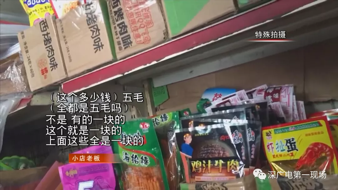 今天上午,記者首先來到福田區(qū)新沙小學附近,可以看到馬路邊上的一家文具店,在門口醒目位置擺放著十幾種包裝各異、色彩鮮艷的小食品,有辣條、牛肉干、薯片等等,老板告訴記者,這些零食價格都是五毛到兩元不等,而在旁邊的一家店鋪,同樣有售賣類似的五毛食品。
