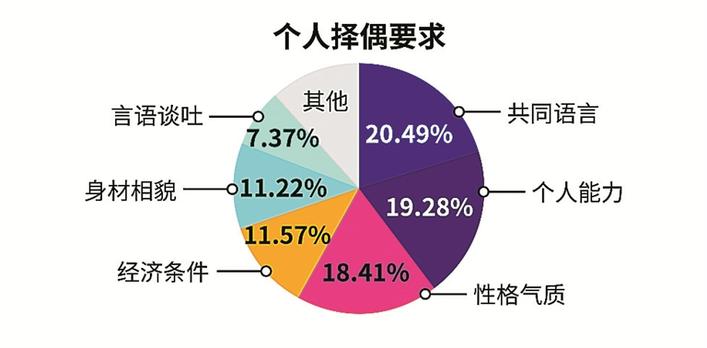 調(diào)查顯示,共同語(yǔ)言、個(gè)人能力、性格氣質(zhì)為單身男女在擇偶時(shí)最看重的三個(gè)方面,其次為經(jīng)濟(jì)條件、身材相貌、言語(yǔ)談吐??梢?jiàn),相較于過(guò)去條件上的匹配,更重視精神上的契合。