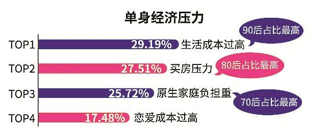 脫單難點(diǎn)中的經(jīng)濟(jì)壓力層面分析發(fā)現(xiàn),生活成本過(guò)高是影響脫單的最大單身壓力,其次是買(mǎi)房壓力,原生家庭負(fù)擔(dān)重以及戀愛(ài)成本過(guò)高。