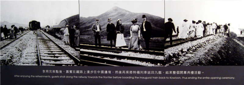 左邊第一張圖為1911年10月15日九廣鐵路全線通車現(xiàn)場(chǎng),右邊兩張圖為參加通車典禮的中英嘉賓的活動(dòng)場(chǎng)景