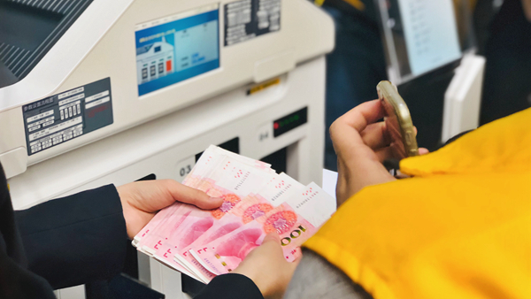 廣電運(yùn)通講解員正展示著智能清分機(jī)的操作。