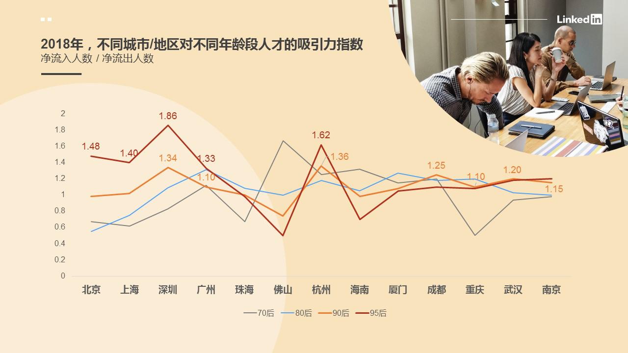 在2018年對95后最具吸引力的前五名城市分別為:深圳、杭州、北京、上海和廣州。但到了90后,當經(jīng)歷了第一份工作、積累了一定工作經(jīng)驗后,一線城市的吸引力開始下降:深圳、廣州排名尚且靠前,但北京、上海的吸引力已顯著下降,一批新一線城市取而代之成為了年輕人的下一個選擇。2018年,90后年輕人的職場第二步普遍開始于杭州、深圳、成都、武漢、南京、廣州、重慶等城市。