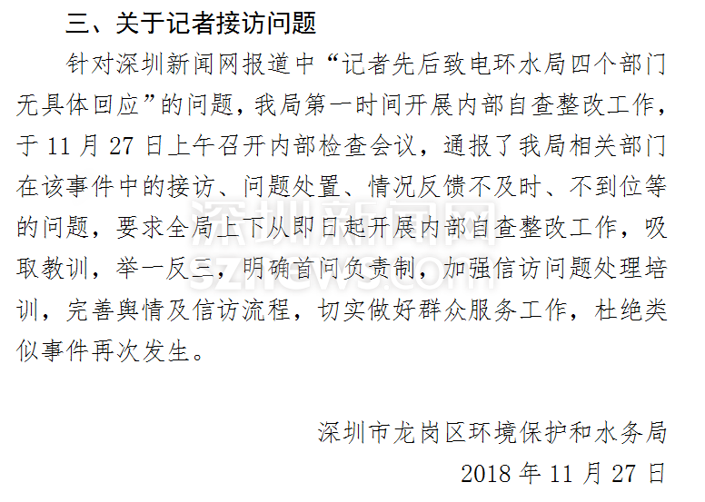 此外,對于前期報(bào)道中記者所提及的“先后致電四個(gè)部門均無具體回復(fù)”的情況,龍崗區(qū)環(huán)水局也給予了回應(yīng)。他們表示將在日后的工作中完善輿情和信訪流程,切實(shí)做好群眾服務(wù)工作。