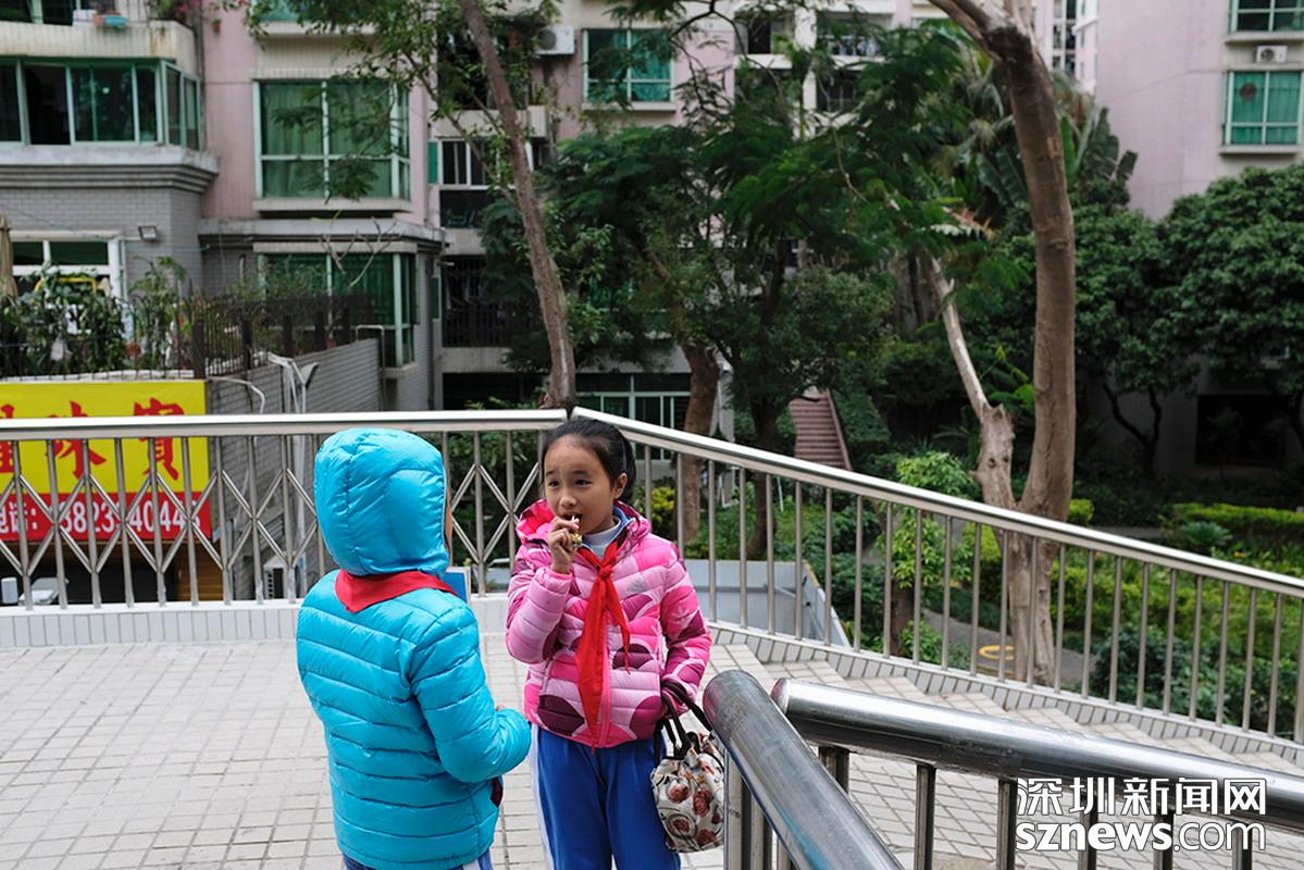 2018年12月12日中午,羅湖翠竹天橋,體感溫度依然很低,兩名學(xué)生穿著羽絨服御寒。