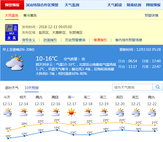 深圳新聞網(wǎng)2018年12月13日訊(記者 施冰冰)記者從深圳市氣象局獲悉,今日天氣寒冷:1多云間陰天,可見陽光,沿海和高地最大陣風(fēng)6級,氣溫11-17℃,北部及山地最低氣溫略低1℃,白天比12日溫暖;14-16日多云,可見陽光,氣溫逐日回升;寒冷黃色預(yù)警將持續(xù)到今日,14日起氣溫回升。
