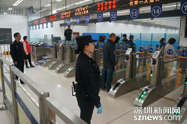 邊檢民警在皇崗口岸出境大廳自助通道區(qū)域監(jiān)護(hù)(黃俊生 陳志偉 攝)