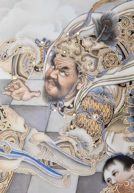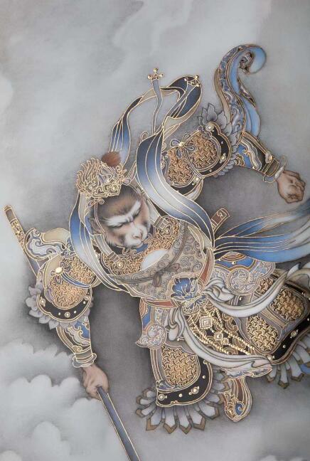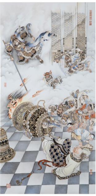 顧堅(jiān)瓷板畫代表作再現(xiàn)了齊天大圣大鬧天宮的經(jīng)典畫面(展覽方 供圖)