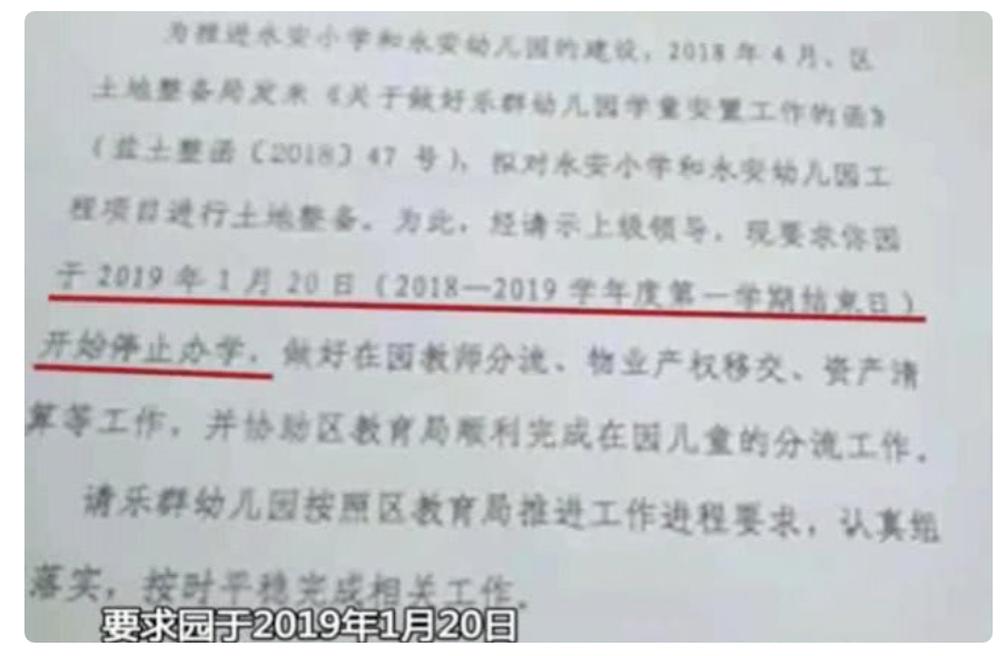 據(jù)了解幼兒園目前現(xiàn)有學(xué)生360名,教職工50人。在停辦通知上我們看見:"要求園于2019年1月20日開始停止辦學(xué)。"原因是"土地整備"包括劉先生在內(nèi)的家長接到這個(gè)消息都炸開了鍋,因?yàn)橥^k一事11月份才告知家長,距離新學(xué)期開學(xué)不到三個(gè)月。