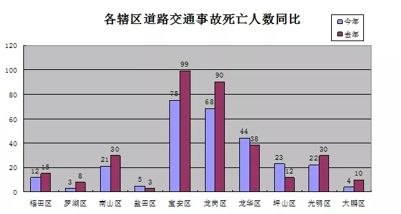 今年以來,在全市各行政區(qū)(新區(qū))中,實現(xiàn)道路交通事故死亡人數(shù)下降的有7個區(qū)。其中寶安區(qū)事故死亡人數(shù)減少24人,龍崗區(qū)事故死亡人數(shù)減少22人,這兩個我市傳統(tǒng)的事故多發(fā)區(qū)事故死亡人數(shù)下降數(shù)占全市事故死亡人數(shù)下降總人數(shù)的79.31%。