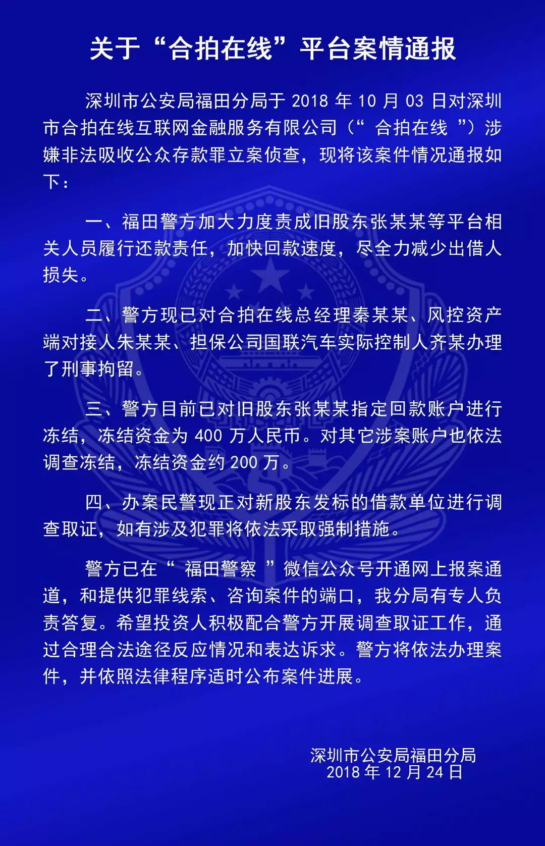關(guān)于“合拍在線”“壹佰金融”“五星財(cái)富”“眾車在線”“財(cái)富中國”“小零錢”“錢爸爸”“合時(shí)代”和“前金融”平臺(tái)的案情通報(bào)