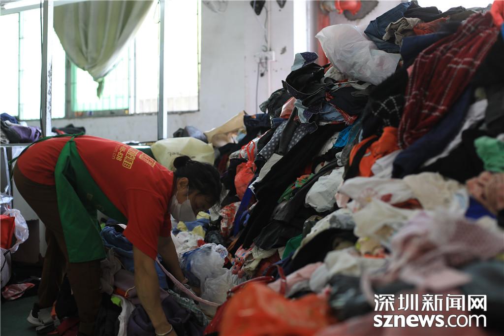 有人高的“衣山”,工作人員進(jìn)行初步篩選