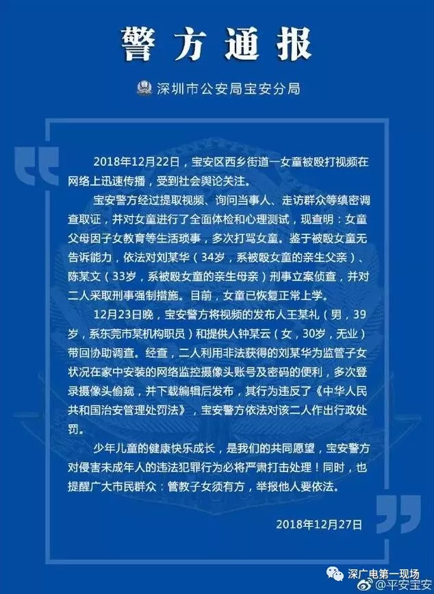 12月27日晚19時許深圳警方通報“父母虐童”案處理結(jié)果:女童父母被采取刑事強(qiáng)制措施 視頻發(fā)布人被行政處罰