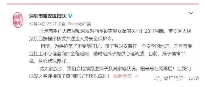 而在稍早前的12月24號,寶安西鄉(xiāng)街道辦發(fā)布的情況通報:寶安區(qū)人民法院于23號晚已經(jīng)簽發(fā)人身安全保護(hù)令,目前已經(jīng)送達(dá)當(dāng)事人及轄區(qū)派出所。