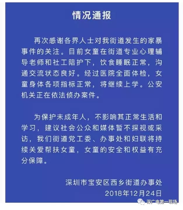 12月24日晚,深圳市寶安區(qū)西鄉(xiāng)街道辦通報表示:目前女童在街道專業(yè)心理輔導(dǎo)老師和社工陪護(hù)下,飲食睡眠正常,溝通交流狀態(tài)良好。經(jīng)過醫(yī)院全面體檢,女童身體各項(xiàng)指標(biāo)正常,將繼續(xù)上學(xué)。